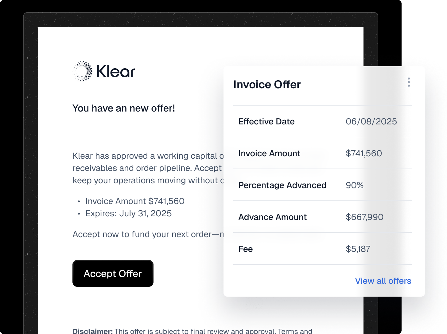You've made the sale and delivered the goods, but you have to wait months to get paid by your corporate or government customer. Klear's unique platform allows us to underwriting financing at a cost, scale and speed that we have yet to see matched anywhere else.